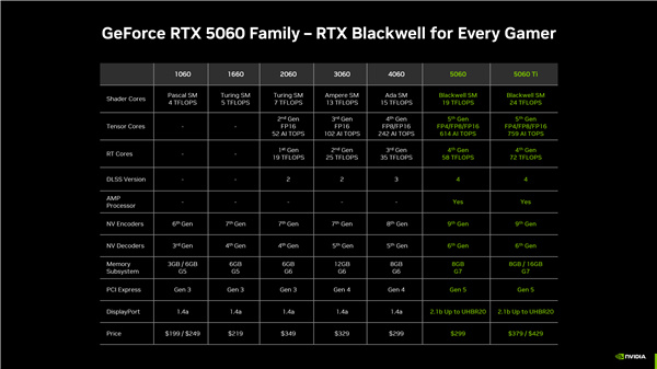 “在支持DLSS 4多帧生成技术的游戏中,其性能是上一代RTX 4060的两倍”,对于使用GTX 1660或RTX 2060等旧款GPU的游戏玩家来说,升级RTX 5060后性能和响应速度将实现更大的提升。
