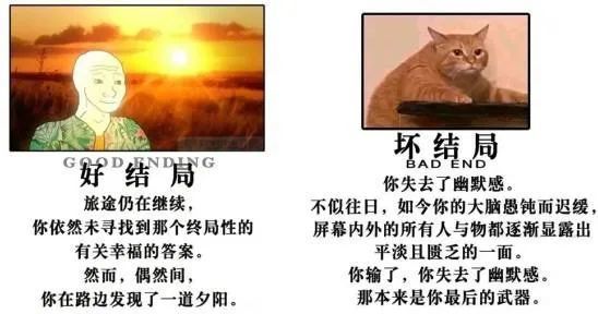其實之前有關“XX的全部結局”的相關梗圖早已出現,創作者們將一部分現實因素融入到遊戲式的分支結局選擇中,繼而發展成爲同時具備戲劇性、哲學性以及荒誕性的“人生結局”。