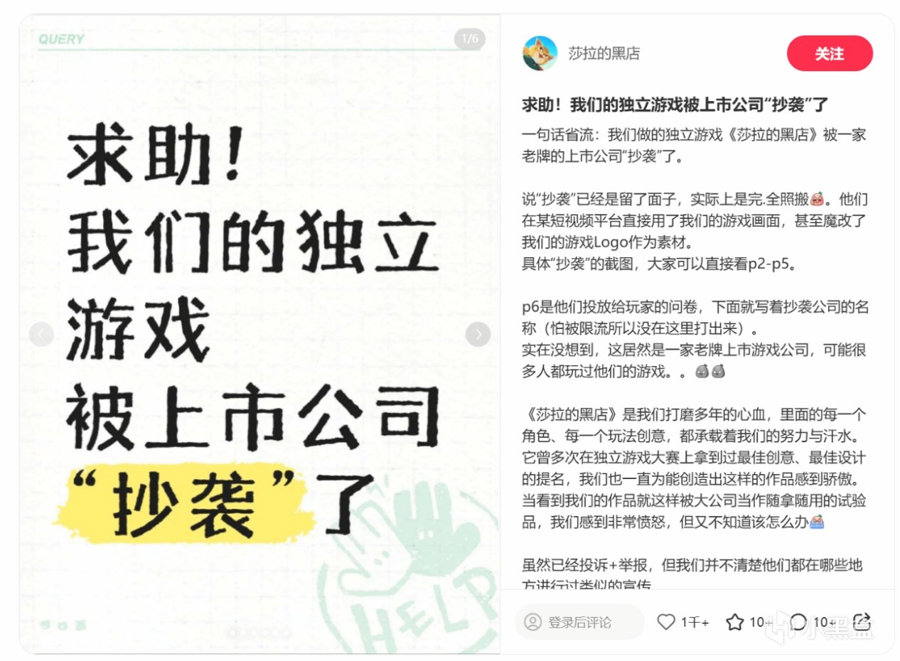 4月15日,《莎拉的黑店》官方在某书上发了一篇求助帖引发了巨大的关注,说是他们的游戏被某个上市的大公司给抄袭了。