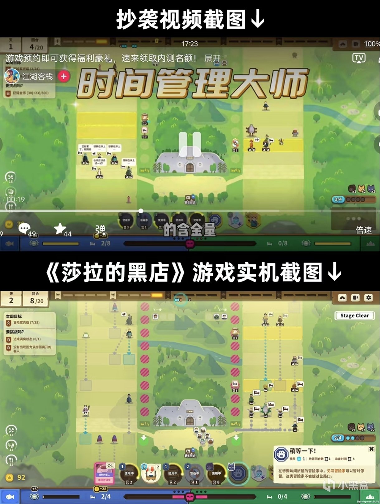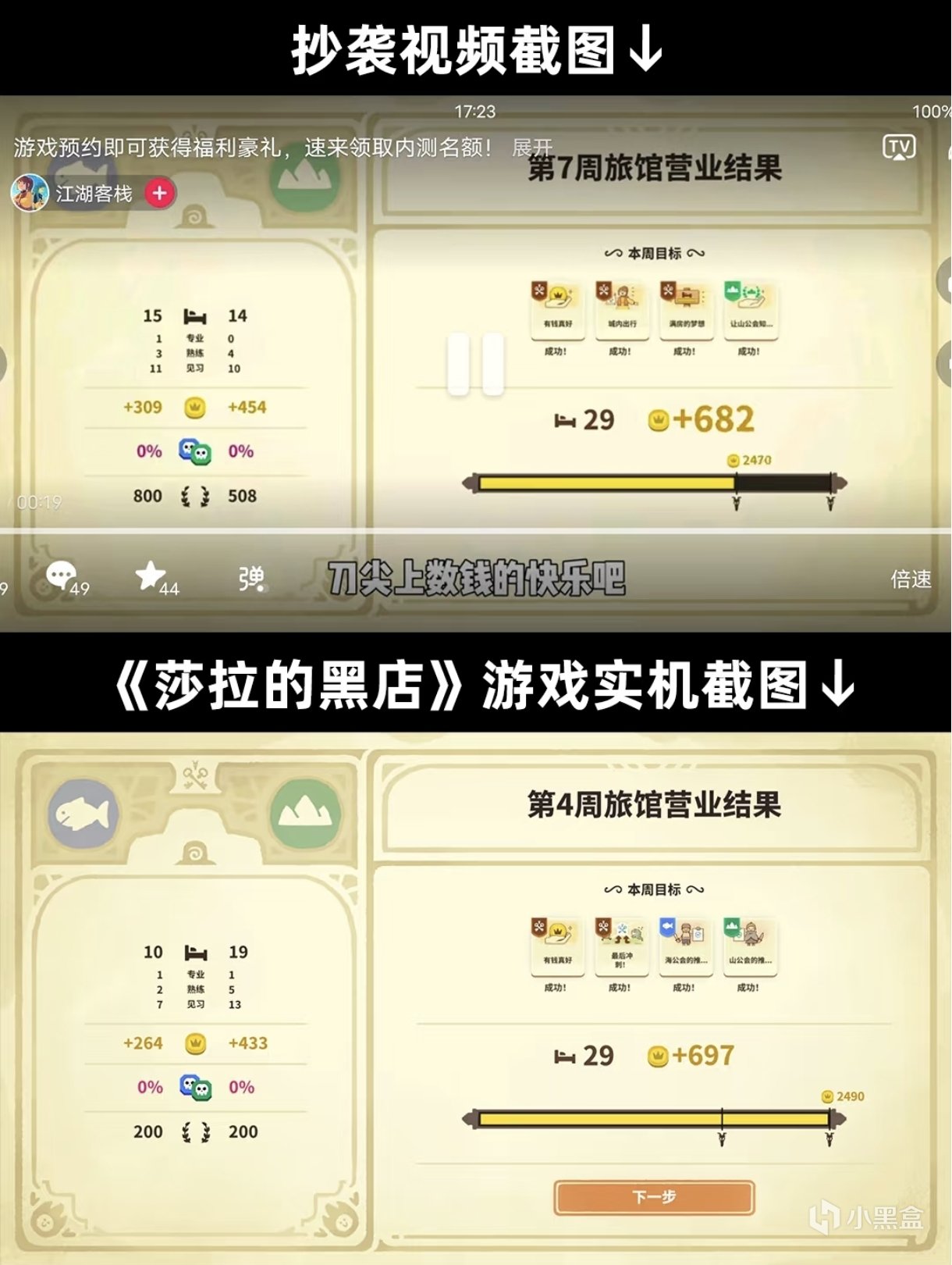 抄袭他们的是一款叫《江湖客栈》的游戏,从官方发布的对比图中能看到,除了调色和部分字体略有区别外,其余的部分可以说和《莎拉的黑店》完全一致。