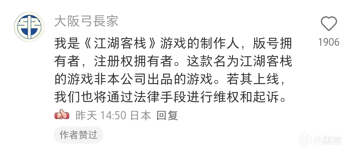 随着事件越演愈烈,一位自称是《江湖客栈》游戏制作人的用户也在这条求助帖下站出来发声,他表示这款抄袭的“江湖客栈”并非是自家公司出品的江湖客栈,原版《江湖客栈》的著作权和版号分别在2019年和2020年的时候就已经公布了。