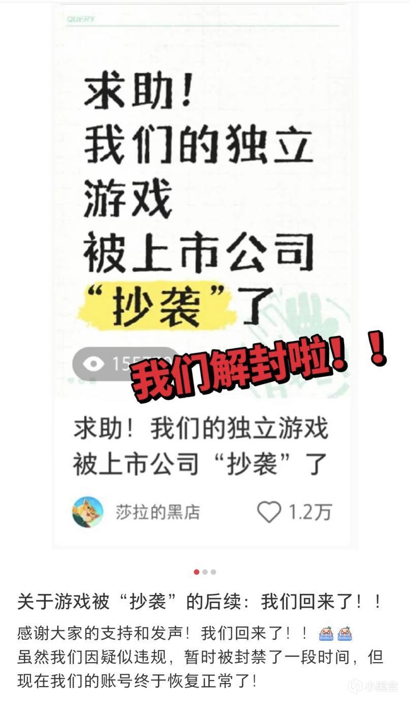 其实像这种独立游戏小厂或是个人开发者被大厂和盗版厂商抄袭、盗用素材,跑来向公众诉苦的事,在座的各位也不是第一次见了,而这件事最搞的一点是,就在官方发帖后的第二天,其在某书上的账号莫名其妙被封了。