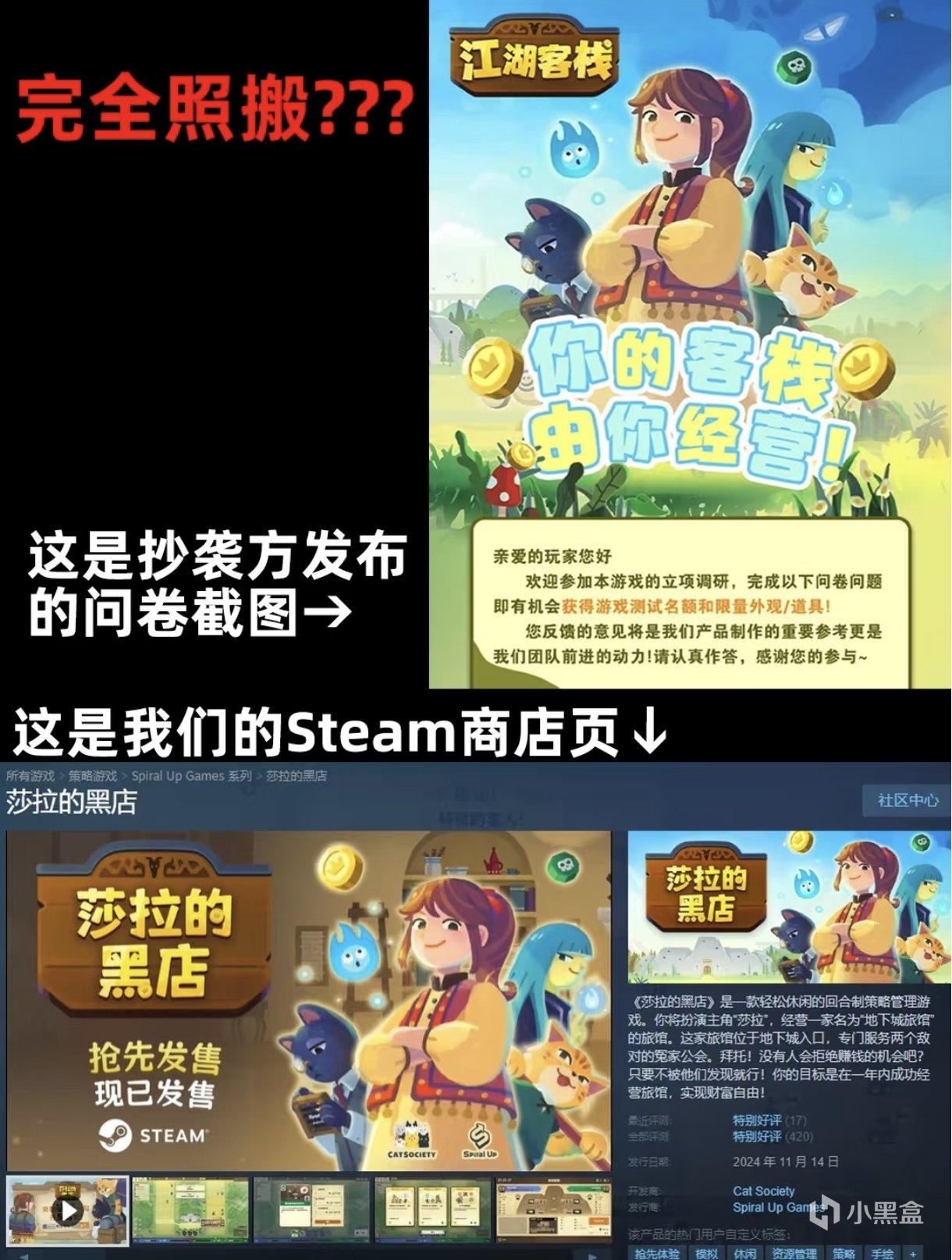 也就是说,搜狐畅游不仅盗用了《莎拉的黑店》的全部内容,就连这个游戏标题也是从正主《江湖客栈》那里偷来的,制作人表示如果真有上线的意图,那么他将和《莎拉的黑店》共同起诉维权。(steam上的《江湖客栈》已与2023年11月转为了免费游戏)