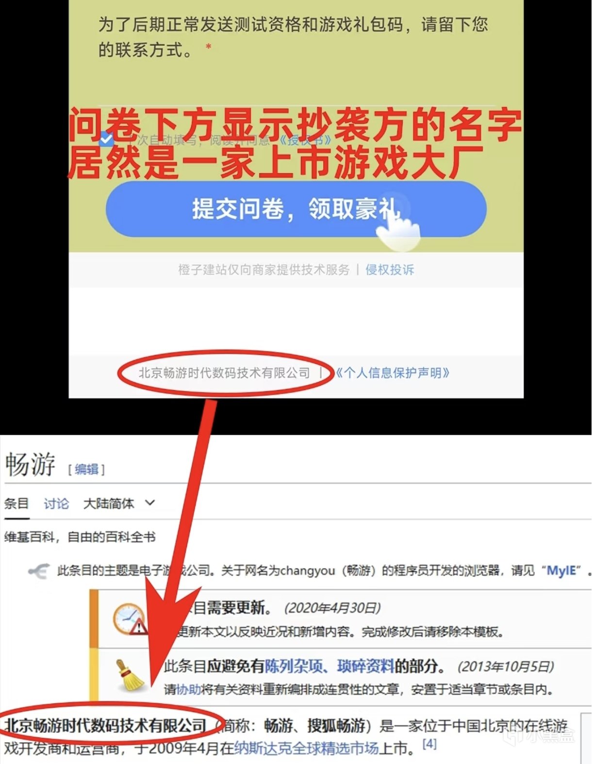 在调查问卷的最下方能够清晰的看到发布者为北京畅游时代数码科技有限公司,也就是网友们俗称的搜狐畅游,他们过去以及现在研发的主方向都是像《天龙八部》《鹿鼎记》这样的大型多人在线网游。