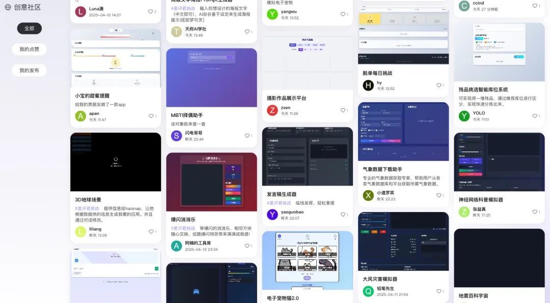 因为 HaiSnap 作为平台,人家还有社区功能。这上面生成的所有应用,不只是能自己用,也可以发布出去让其他用户都体验,反馈,修改,最后让你的想法真正变成一个成熟的应用,并且实现商业化。