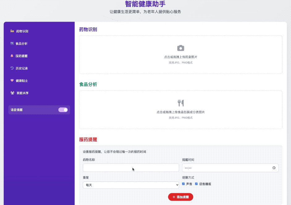 比如老年人吃药可能容易漏服,或者记错搭配,就可以让 AI 生成一个帮老年人提醒吃药的工具。可以上传药盒的照片, AI 识别药物名称和剂量,自动生成服药计划;