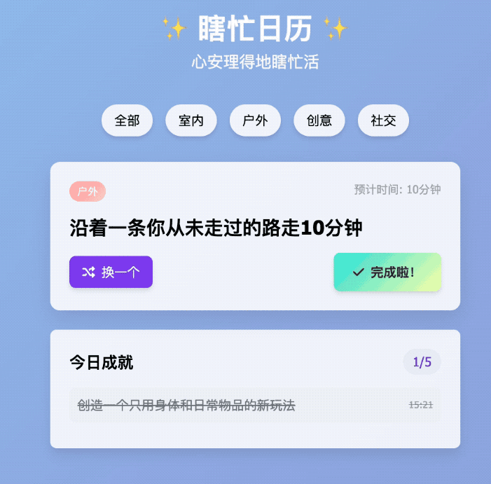 比如说,现在效率工具、待办事项 App 太多了,咱就是说能不能反过来,搞个纯粹消磨时间、制造“伪忙碌感”的工具? 就叫它瞎忙日历。