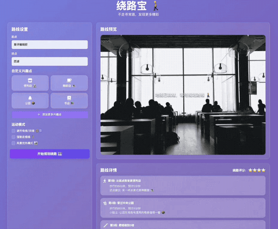 目的就是给你绕路,规划奇葩路线,比如强制经过三家不同的便利店,提示你进去买点啥;或者专门避开电梯、扶梯,让你硬爬楼梯锻炼身体。虽然“没啥卵用”,但重点是慢下来、体验过程的趣味。