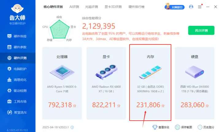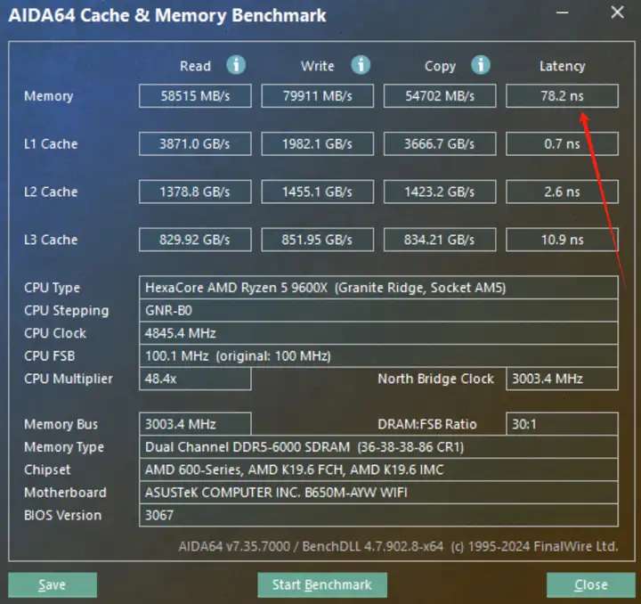 这个CPU是9600X,内存换成同样6000频率C36的英睿达PRO,表现如下:
