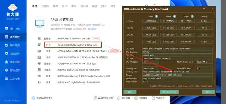 开个EXPO让其跑到6000Mhz、这套内存的标称频率,正常开机跑分: