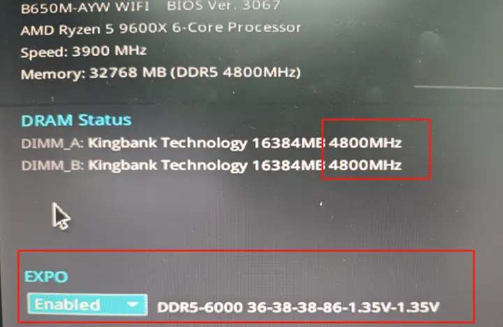 进BIOS看看情况,识别到是金百达内存(Kingbank),频率默认是4800Mhz: