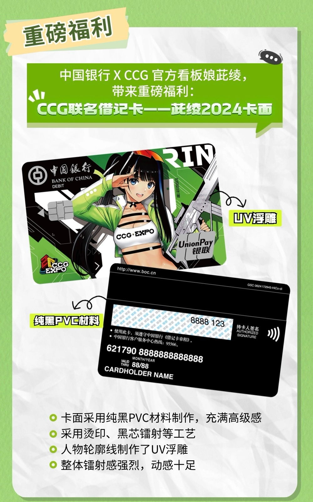 - 中國銀行ccg2024聯名卡:挺好看的,以前可以網申了,現在去上海分行應該還能開到。