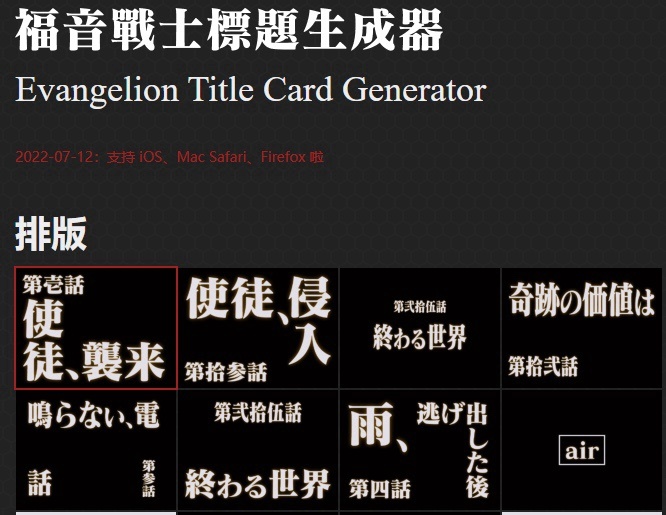 ✨ 亮点:一键生成《新世纪福音战士》同款标题字体!输入文字自动套用经典排版,动漫迷做视频封面、设计周边超酷,中二感拉满~