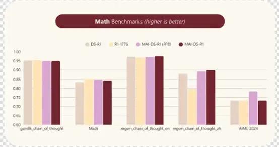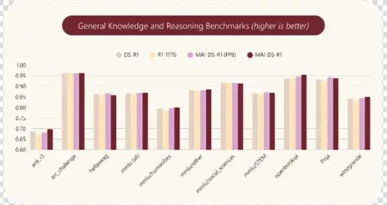 在推理能力方面,MAI-DS-R1保持了與DeepSeek R1相同的推理能力,在一般知識、推理、數學和編程基準測試中表現非常出色。