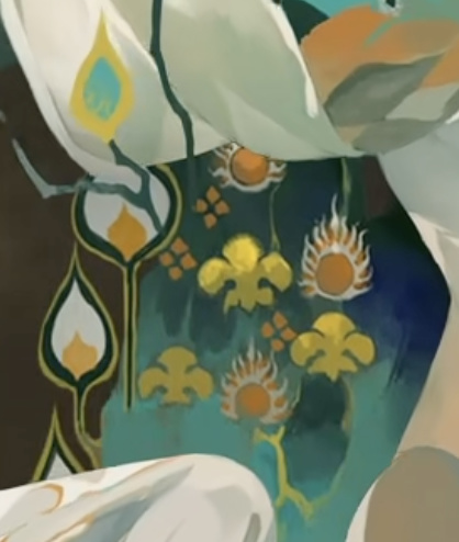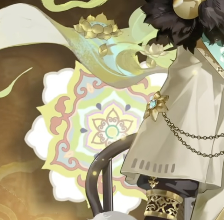 再如整體紋樣的設計,製作組從莫高窟的壁畫中取材,融合火焰紋、雲氣紋、蓮花紋、卷草紋等元素,在視覺上增加了角色的穩重感,也強化了其精神守護者形象。