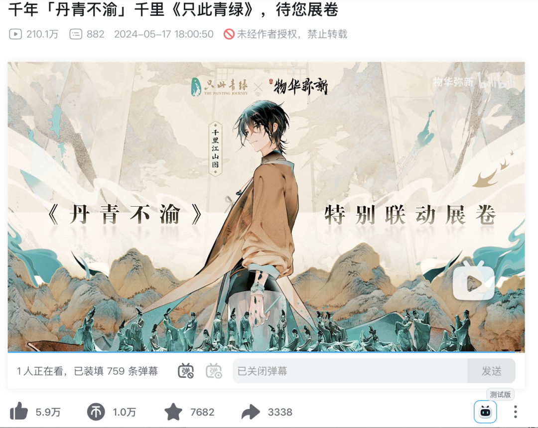 比如《物華彌新》早期和舞劇《只此青綠》的聯動,那時遊戲登場了角色「千里江山圖」。聯動的雙方都是東方美學、文物國寶的再創作,氣質十分契合,最終的質感也很不錯,聯動版本的角色流水破千萬。