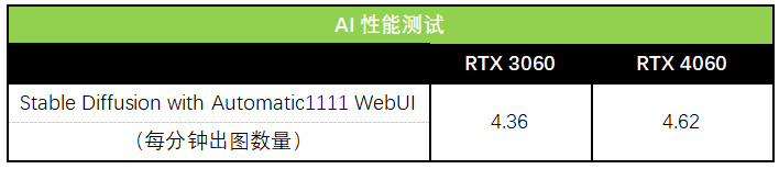 AI性能部分,RTX 3060每分钟可以出图4.36张,RTX 4060每分钟可以出图4.62张,两者相差为6%。如果是用于3D渲染或者视频剪辑,RTX 4060的效率要比RXT 3060高不少,两块显卡的AI性能则差别不大。当然,对于普通玩家来说,两款显卡最大的区别就是RTX 4060支持AV1硬件解码,在看AV1格式的流媒体视频的时候会更流畅一些。