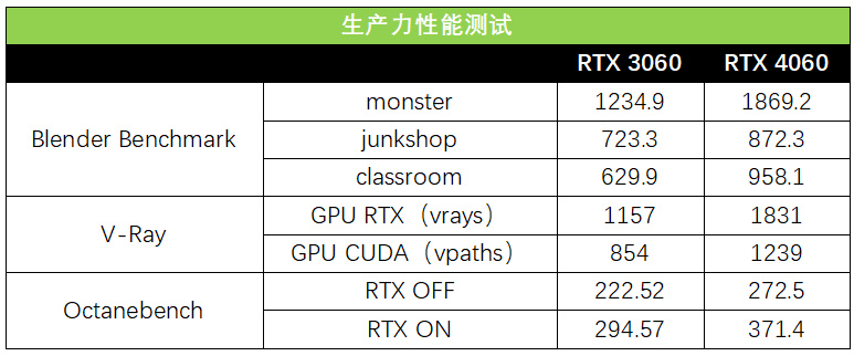 生产力性能部分,从测试结果来看,RTX 3060相对RTX 4060还是有比较大的差距,在Blender Benchmark中,RTX 4060平均比RTX 3060高了41%。在V-Ray中无论是使用RTX还是CUDA时的渲染效率相对于RTX 4060都要落后45%以上,OC渲染器中的性能最多落后RTX 4060约26%。