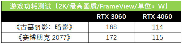 最后,我们再来对比一下RTX 3060和RTX 4060的功耗表现。我们用FrameView工具在游戏中记录并计算出平均功率,从结果来看,RTX 3060在运行2K游戏时的平均功耗为170W,RTX 4060平均游戏功耗为115W,RTX 3060的平均游戏功耗比RTX 4060高了近50%,在节能方面RTX 3060的表现一般。
