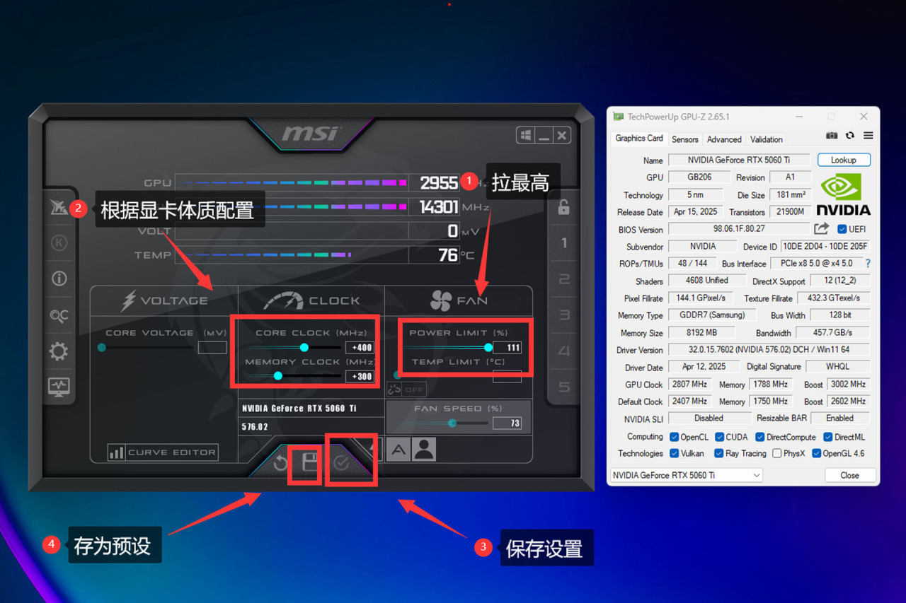 ● 硬件方面,CUDA核心从4352个升级到4608个,显存从GDDR6X升级到GDDR7,对应上限更高的超频空间。