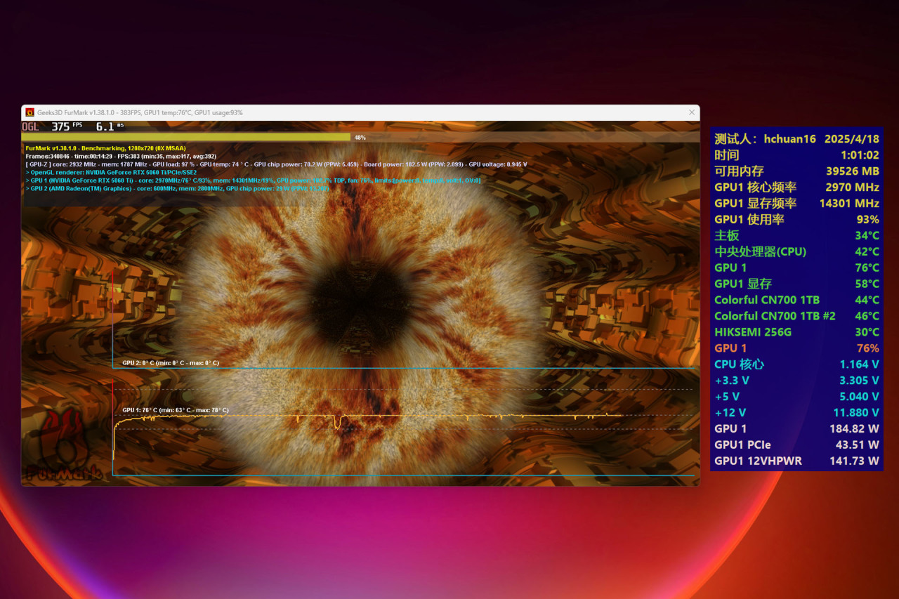 这里我做了超频,功耗相比默认高了20W,期间的波动是在调试频率,温度实际上是没啥大变化的。