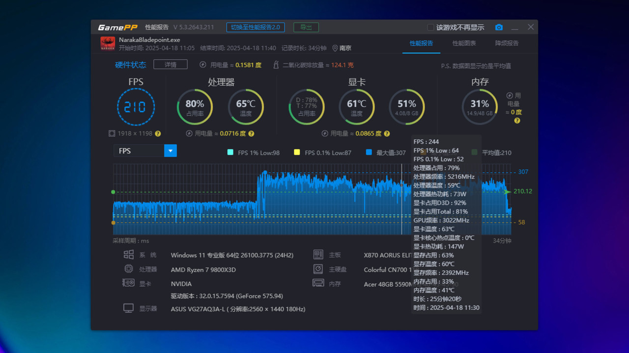 无畏契约这类低要求游戏就不测试了,首先是要求配置较高的常规动作网游,案例选择永劫无间(DX12),画质选择2K分辨率+全高画质+开启补帧,测试结果如下图所示:
