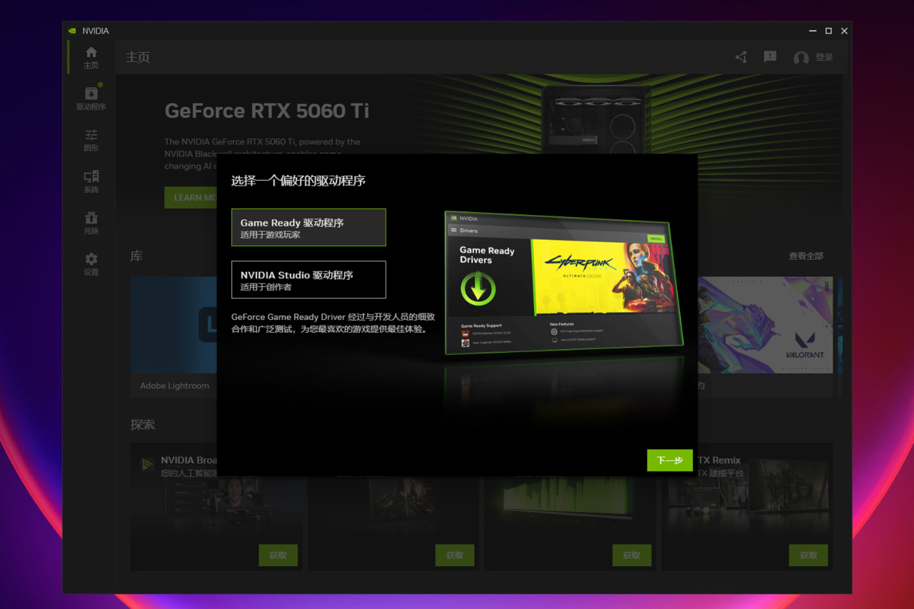 首次安装会有个偏好选择,游戏选Game Ready,跑生产力工具选NVIDIA Studio,后期可以随时切换。