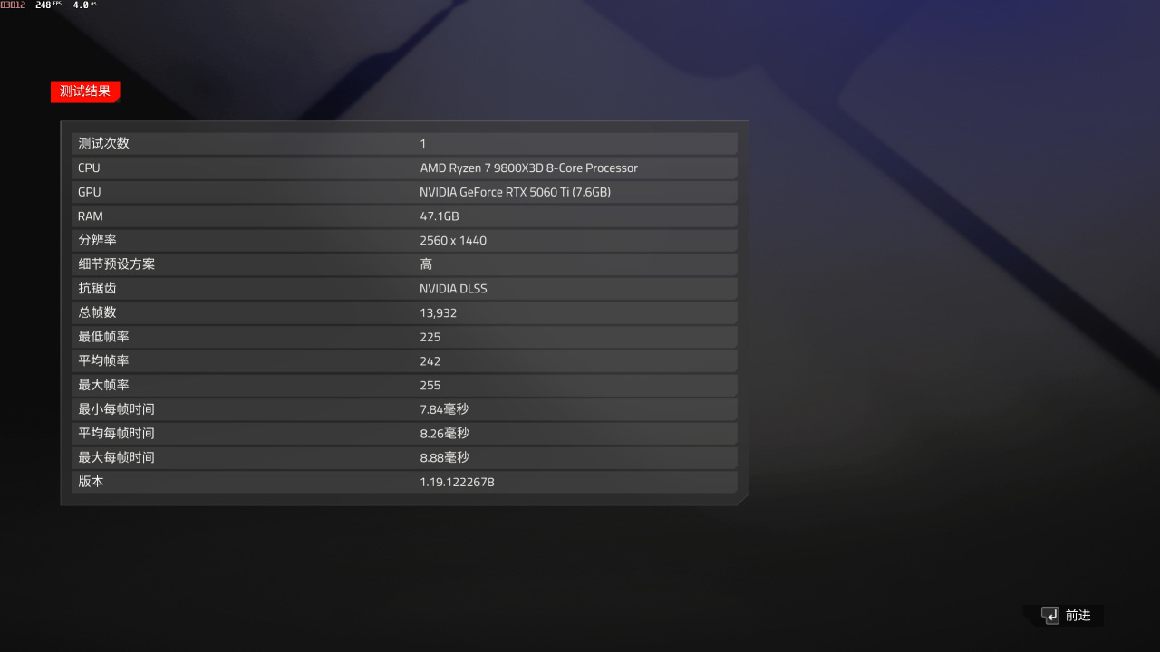 ● 画质选择2K分辨率+默认高特效+开启DLSS+开启光追,平均帧数为242FPS。