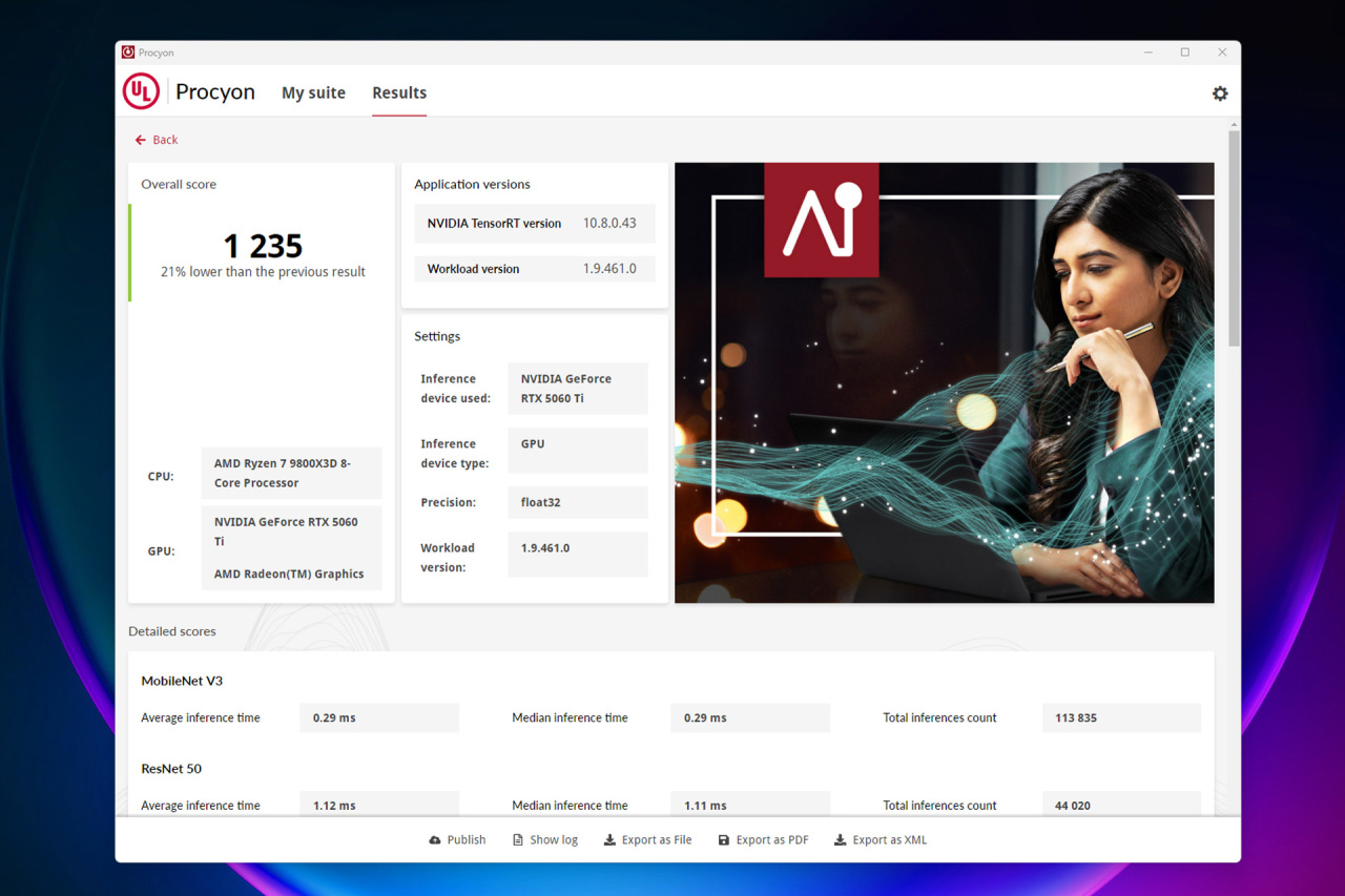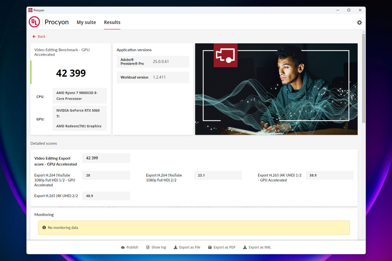 首先是代表视觉AI性能的UL Proycon AI Video模组,对应Adobe等生产力工具的AI功能,测试结果如下图所示: