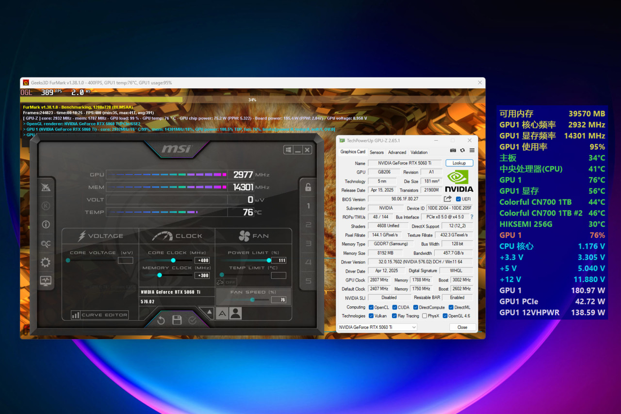 小飞机配置完成后不代表超频完成,一定要用FurMark等压力测试工具跑一轮,监测下各项数据: