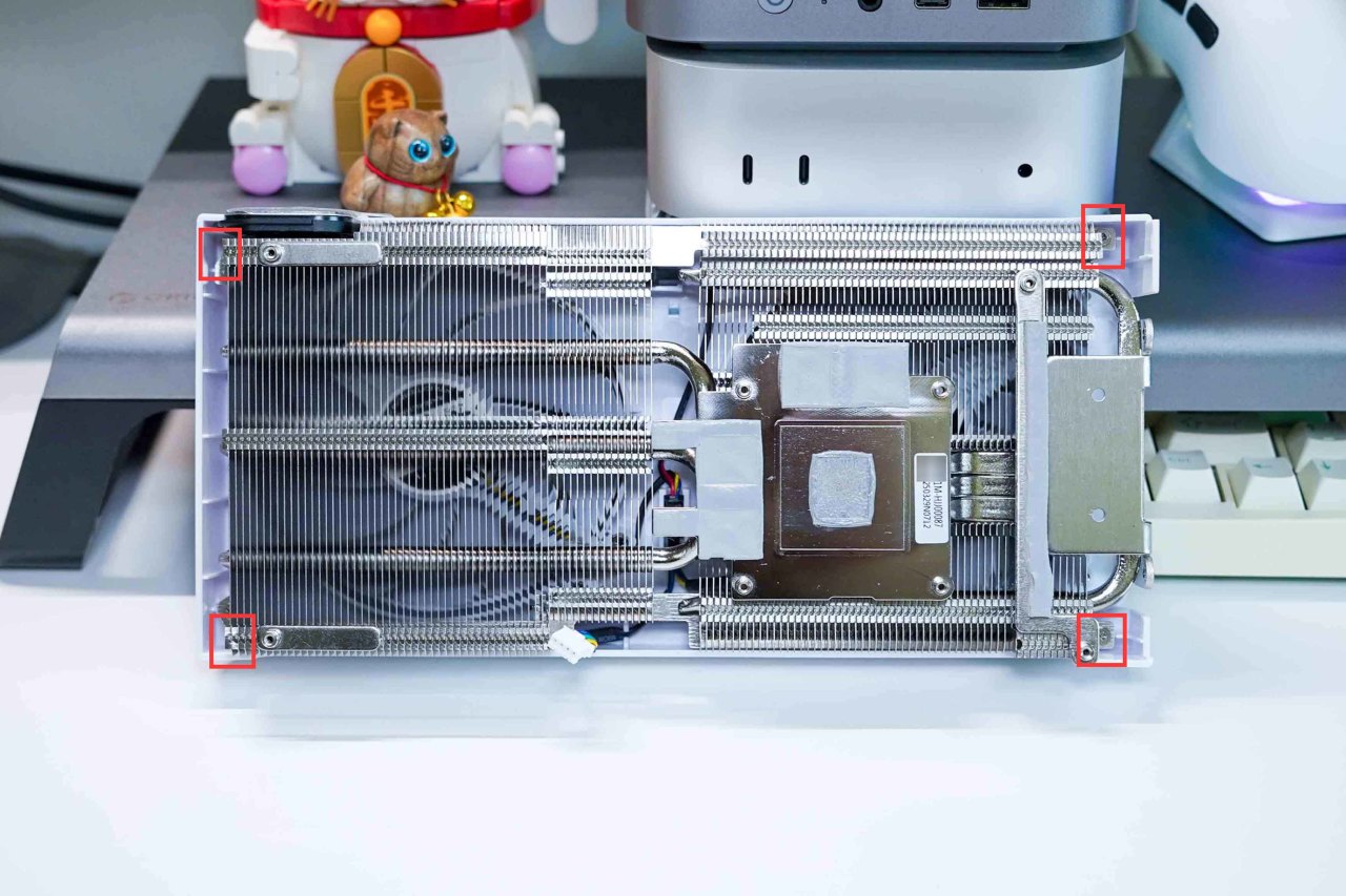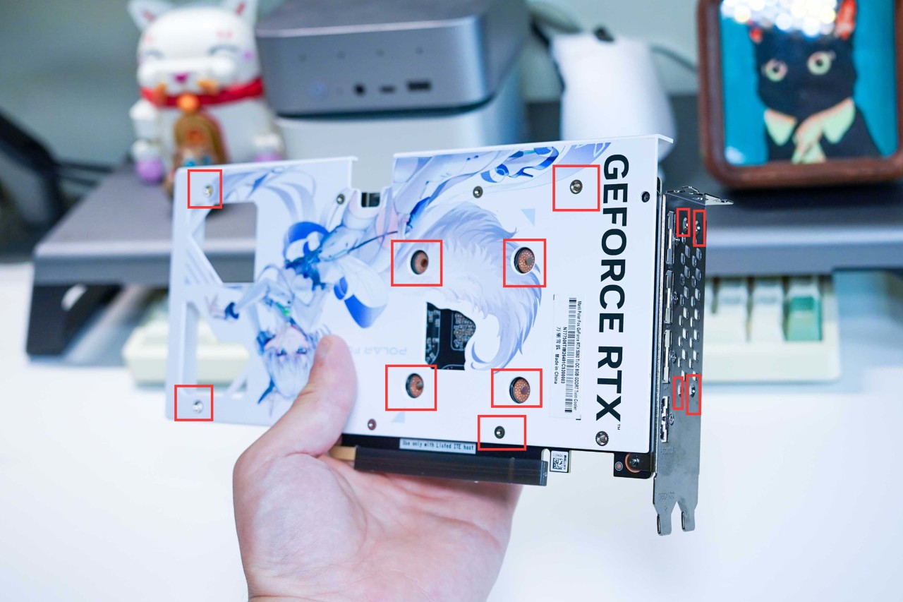 万丽雪狐RTX 5060Ti OC 8G的拆解比较简单,使用常规四角批头的螺丝刀,卸掉下图圈出12颗螺丝即可卸掉背板。