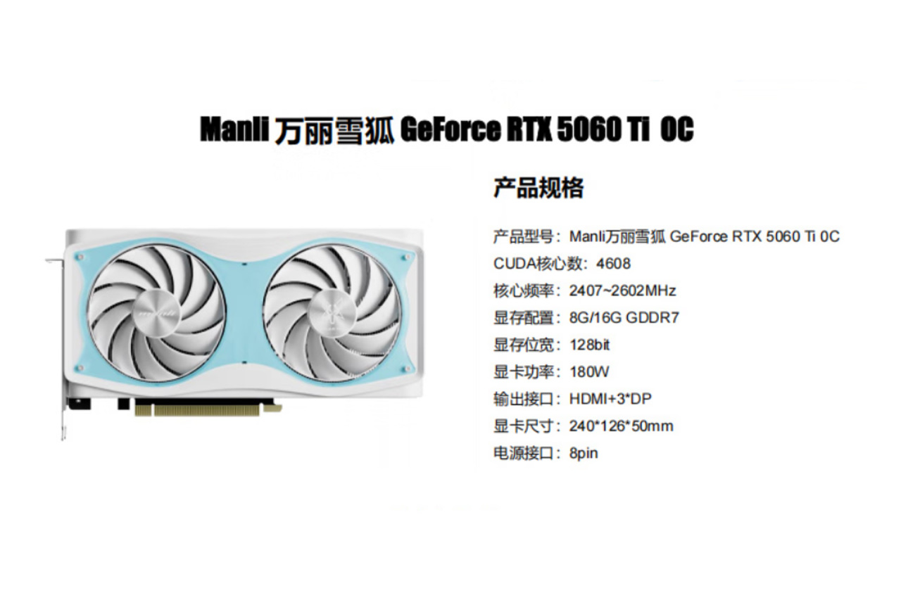 ● 本次测试的是万丽雪狐GeForce RTX 5060Ti OC 8G,这张卡挺好看的,也有蛮大的超频空间,外加送个立牌,很推荐打算装颜值光污染主机的玩家入手。