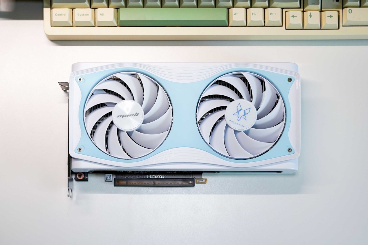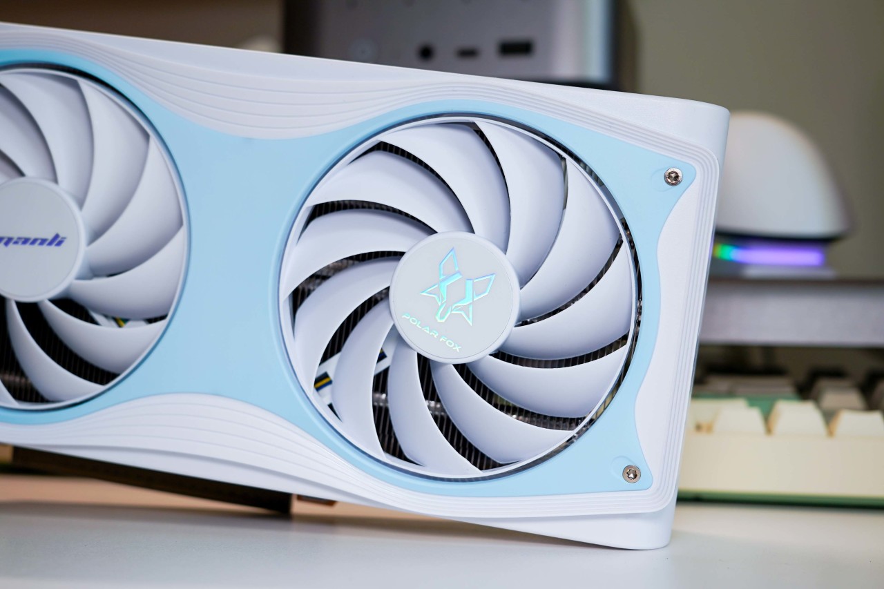 这张显卡最大的特点就是造型漂亮,正面为狐型萌态面板,主色调为淡蓝色+白色,同时还有梯度式设计,不仅视觉上比较立体,同时也能辅助导热。