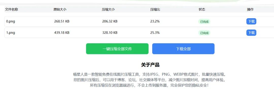 所有操作仅在浏览器端完成,不会上传到服务器,你的图片数据不会被存储或泄露,可以放心地压缩自己的照片、工作文件,不用担心隐私问题。