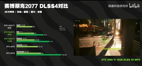 在《赛博朋克2077》中,2K分辨率下开启DLSS 4后,RTX 5060 Ti 16GB的DLSS 4X MFG成绩为113,而8GB版本仅为92.4,16GB版本领先22.30%。