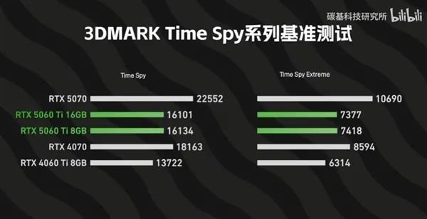 在3DMark Fire Strike测试中,RTX 5060 Ti 8GB和16GB的分数几乎相同,与前一代RTX 4060 Ti 8GB相比,性能提升了最高29%。