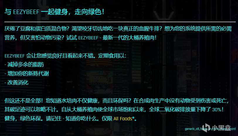 在2077年的夜之城,幾乎沒人會自己做飯,遍佈全城的生物技術子公司全食品商店和其他便利店會提供便捷低價的餐飲服務,全食品擁有包括基因改造的肉類,海藻合成的蔬菜和合成雞蛋等諸多拳頭產品,還在最近推出了新一代健康合成牛肉。價格太高?沒關係,還有更低價的一元一塊餐廳,它們擁有風靡夜之城的一歐元披薩,至於食品安全問題,詳情請看NCPD的食品中毒命案卷宗。