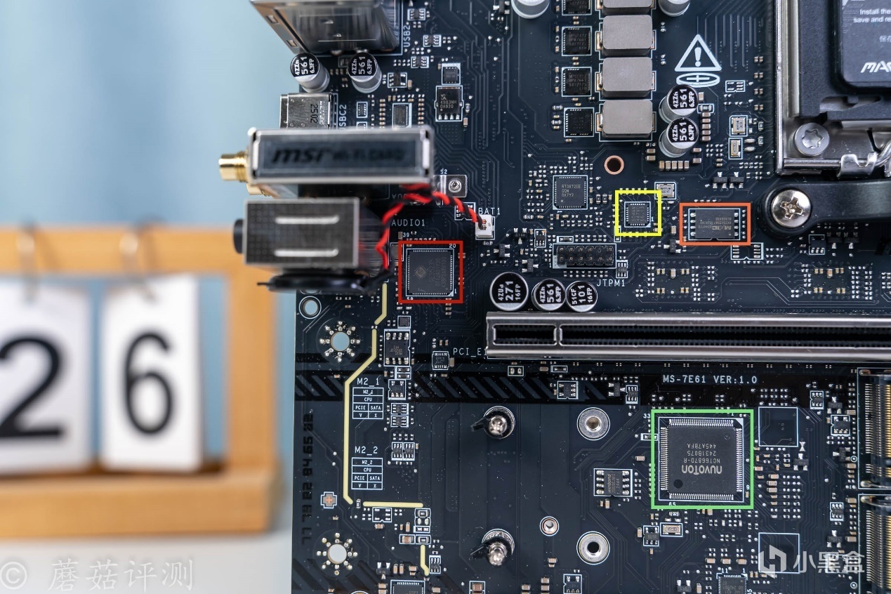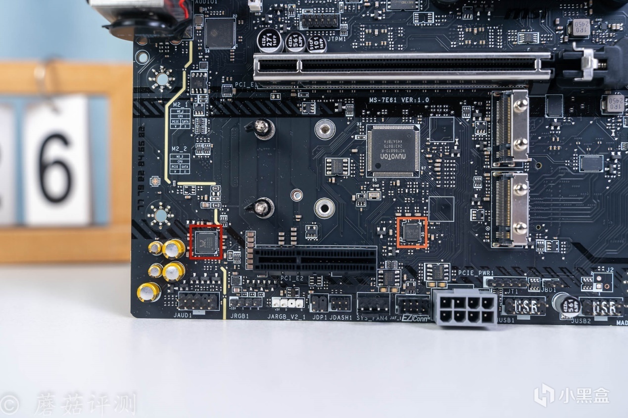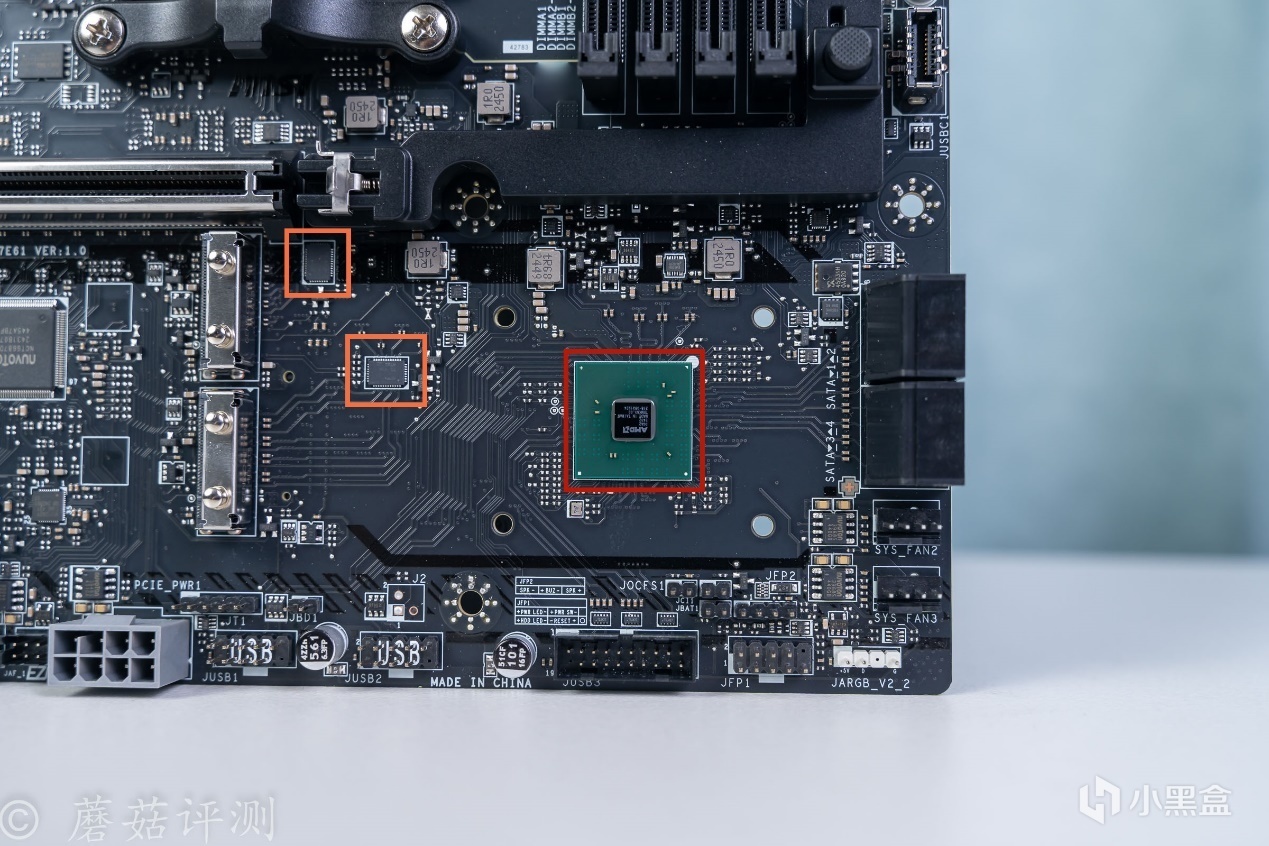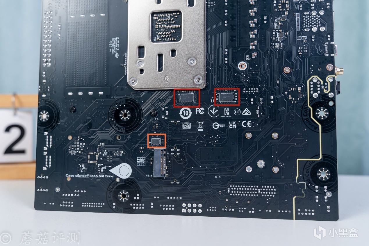 ▼主板右下角,红框芯片为南桥芯片;左上角的橙框芯片为PCIe 5.0桥接拆分芯片,给旁边的两个PCIe 5.0的M2插槽提供支持。