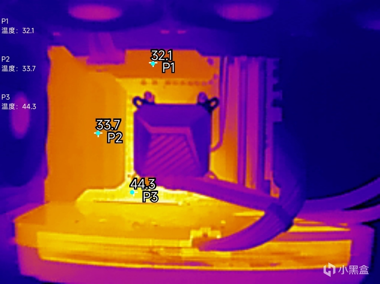 ▼处理器的温度升高,风扇的转速提高,主板供电散热件的表面温度均有降低,左侧降到33.7℃,上侧降到32.1℃,处理器插座底部温度稳定提高,在44.3℃。
