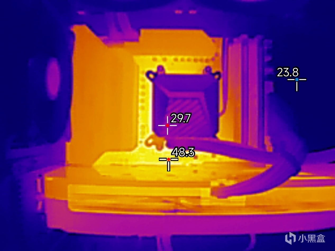 ▼简单看下主板供电部分的最高、最低温度,处理器插座底部48.3℃,旁边的机箱23.8℃。