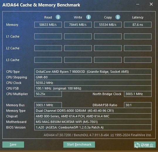 ▼简单跑个内存的读写测试,内存读取速度58633MB/s、写入速度78445MB/s、复制55534MB/s,延迟87.6ns。