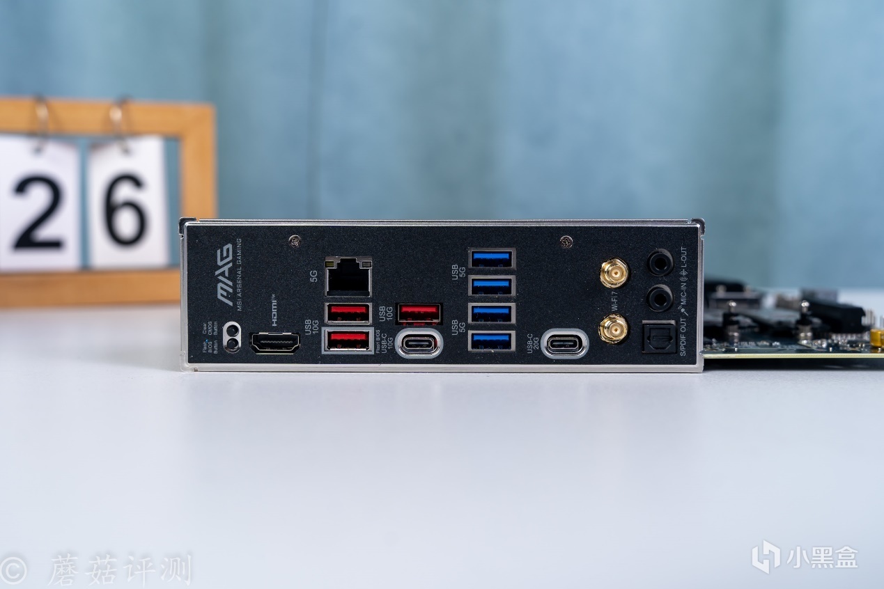 ▼主板后部的IO面板,从左到右依次是BIOS 清除按键、BIOS刷写按键、HDMI视频输出接口、USB 3.2 Gen2 Type-A接口3个(其中一个支持BIOS无U刷写)、5Gbps带宽的有线Lan口、USB 3.2 Gen2 Type-C接口1个、USB 3.2 Gen1 Type-A接口四个、20Gbps带宽的USB-C接口1个、WIFI 7天线插座和3个音频接口。