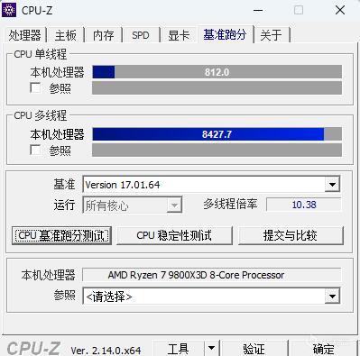 ▼简单跑个CPU-Z的性能测试,单核得分812,多核得分8427.7。