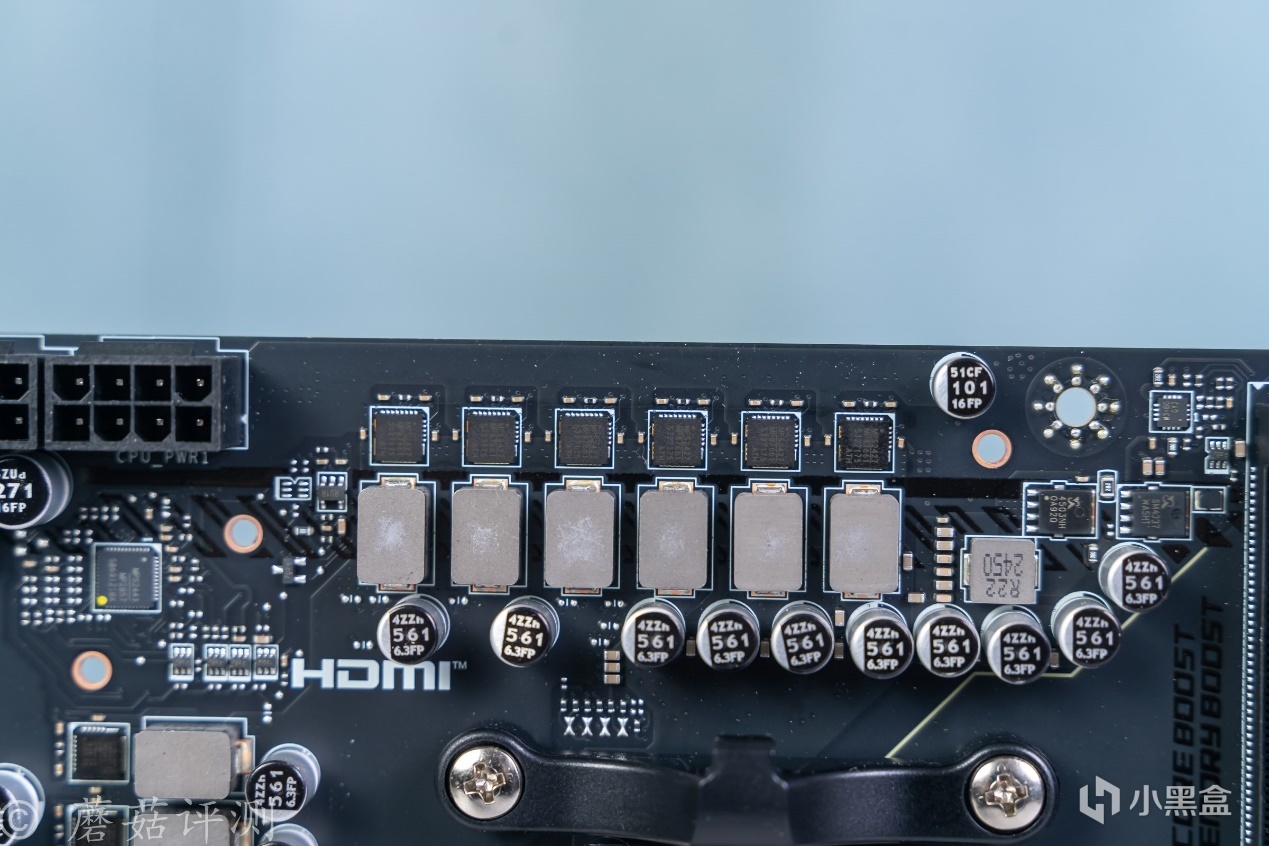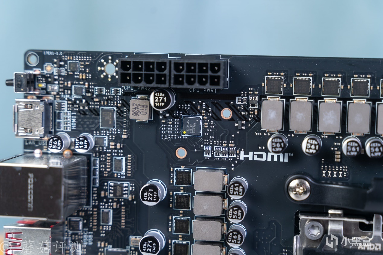 ▼左上角是双8Pin的辅助供电插座,针脚都是实心设计,过流能力强,底部还有一些电感电容。