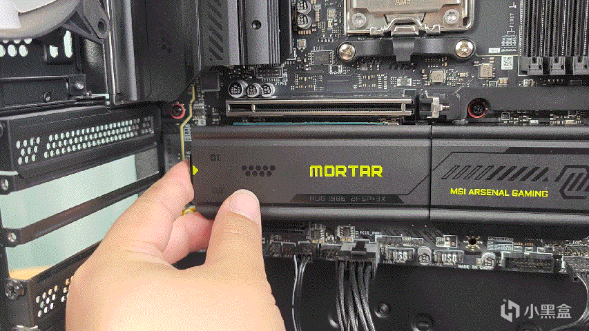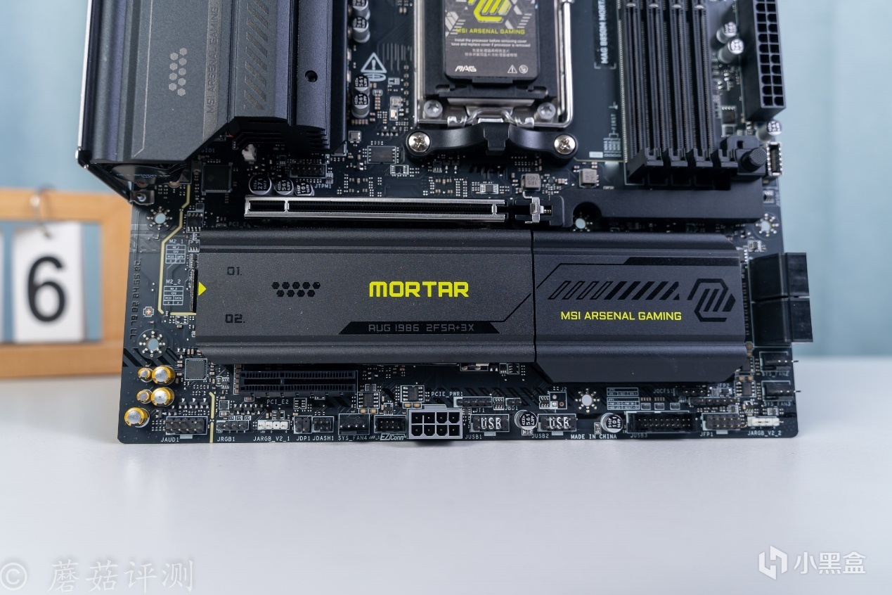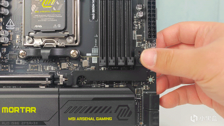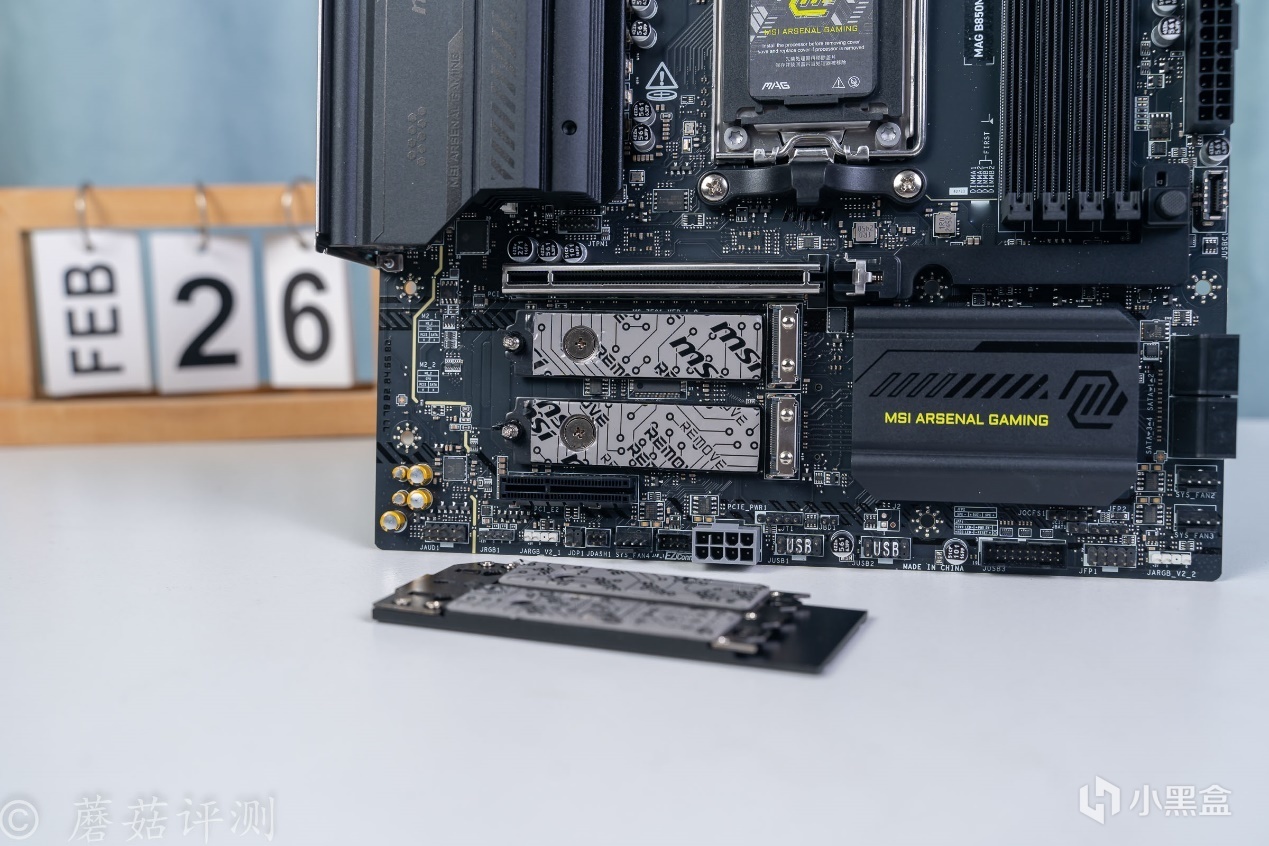 ▼微星B850M迫击炮主板底部的M2金属散热片支持快拆,对准位置放上去,轻轻按一下就能固定,体验很棒。