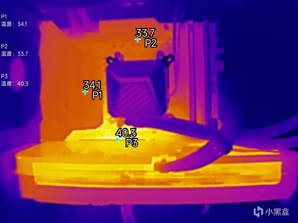 ▼待机情况下,主板的左侧金属散热片表面温度34.1℃,上侧金属散热件温度33.7℃,处理器插座底部的温度最高,在40.3℃。