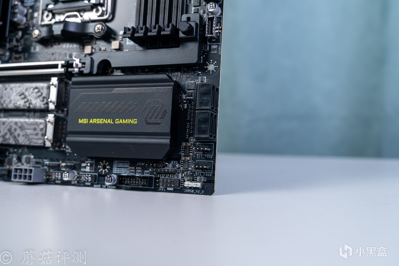 ▼主板外观非常漂亮,整体采用黑色配色,正面覆盖有很多金属覆盖件。