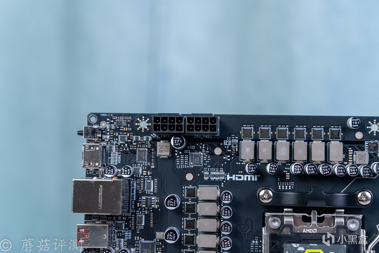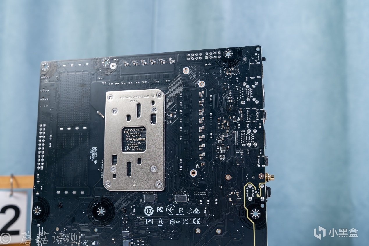 ▼处理器插座是熟悉的AM5,插座饰罩上还有漂亮的贴纸,插座周围是密密麻麻的电容,看着供电很给力。
