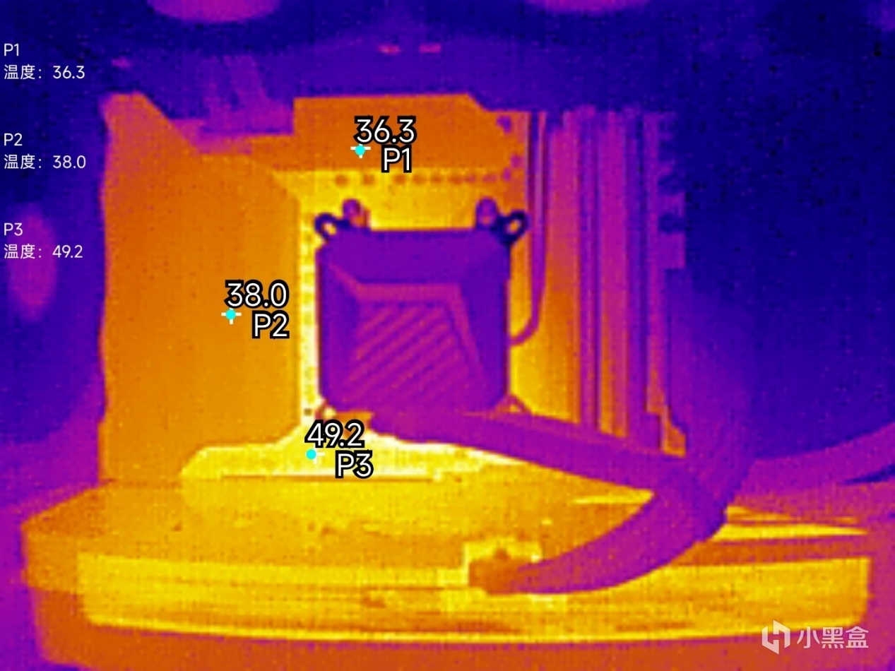 ▼主板左侧金属散热件表面温度38℃左右,上侧金属散热件表面温度在36.3℃,处理器插座底部温度在49.2℃,整体表现不错。微星B850M迫击炮这块主板,供电规格十分给力,应付9800X3D这种处理器轻轻松松,满载情况下的供电部分温度也很低。