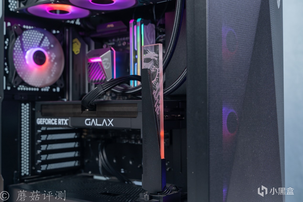 ▼另外,这款机箱标配显卡支架,显卡支架的支臂是钢化玻璃材质,支持ARGB灯效,颜值和功能性都不错。